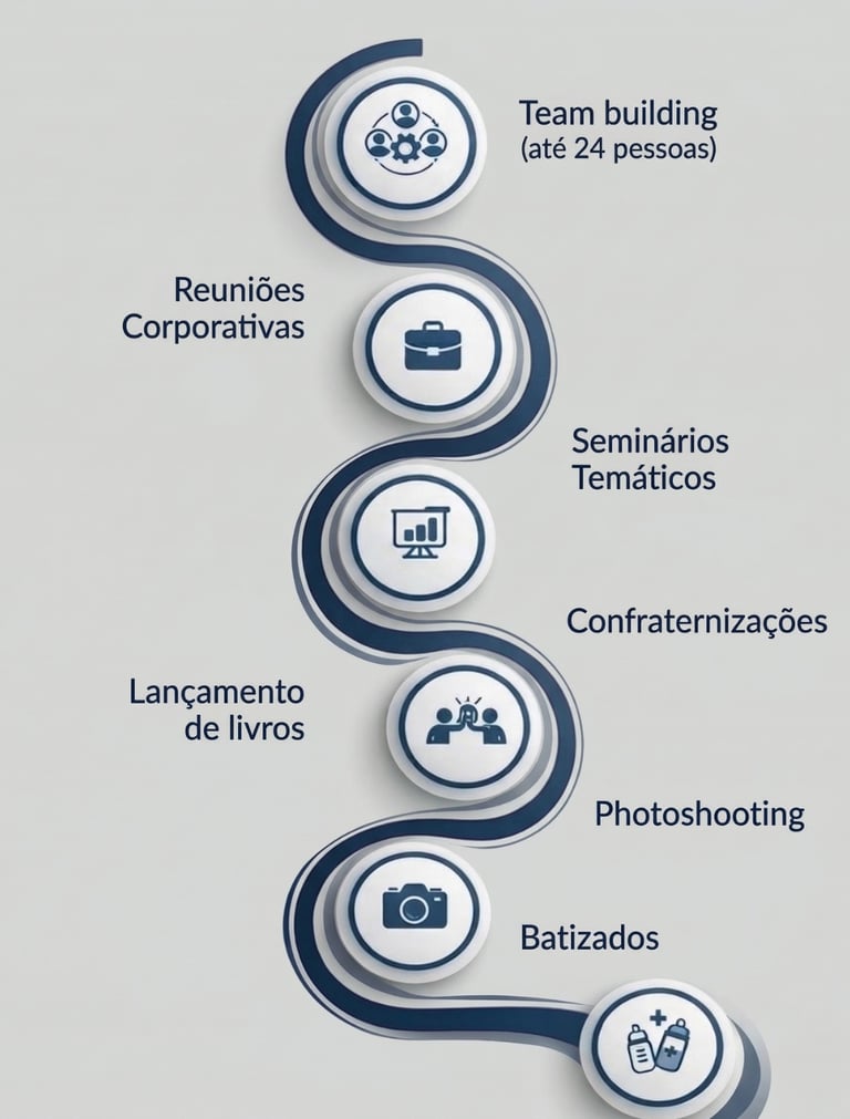 Abrimos nosso espaço para grupos e eventos diversos como, reuniões corporativas, pequenos grupos de team building, seminários temáticos, lançamento de livros, photoshooting, confraternizações, batizados, entre outros. Personalizamos nosso espaço para você. Os grupos podem alugar o local e beneficiar-se de uma estrutura pensada para favorecer a tranquilidade, a convivência e a escuta.